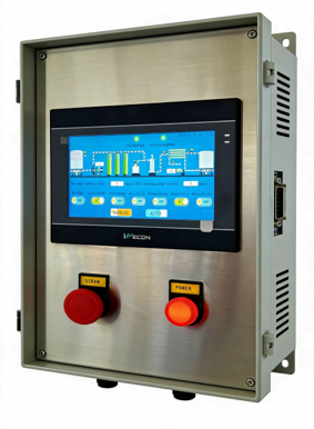 智慧電控箱(核心控制中樞)採用工業級觸控顯示器與一體化機殼設計,