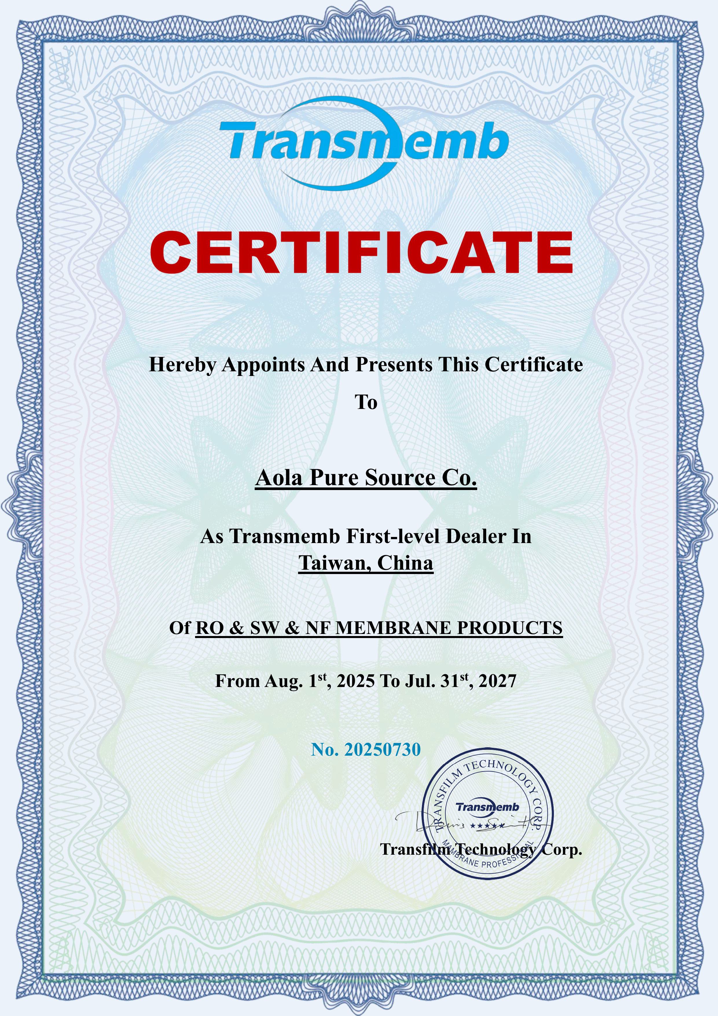 奧拉淨源很高興從今日正式宣佈,已與全球知名過濾技術品牌 Transmemb 達成戰略合作,取得其全系列產品之正式經銷授權。