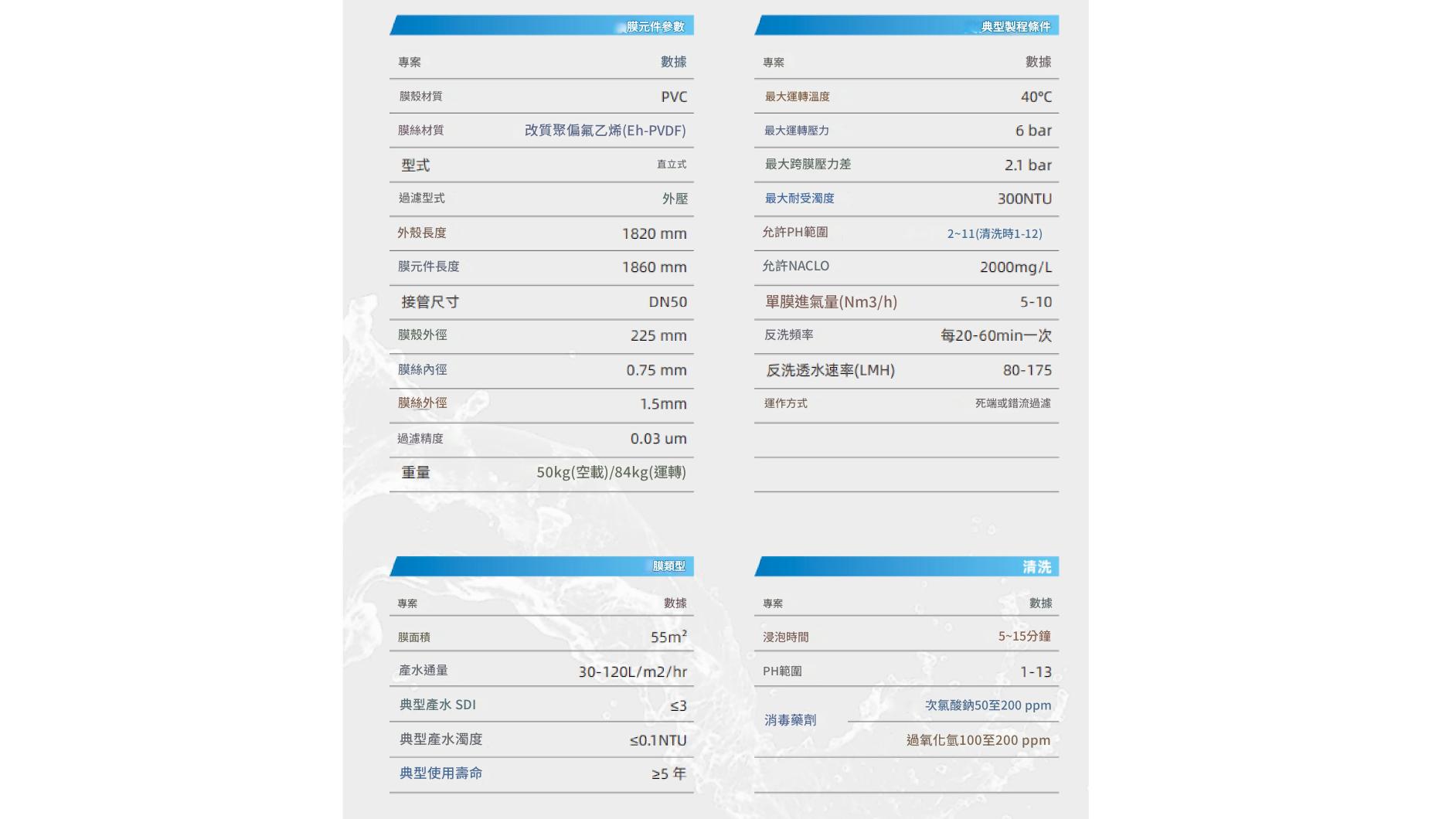 • 採用抗污染能力強、強度高的改性PVDF材料,有效延長膜的使用壽命。